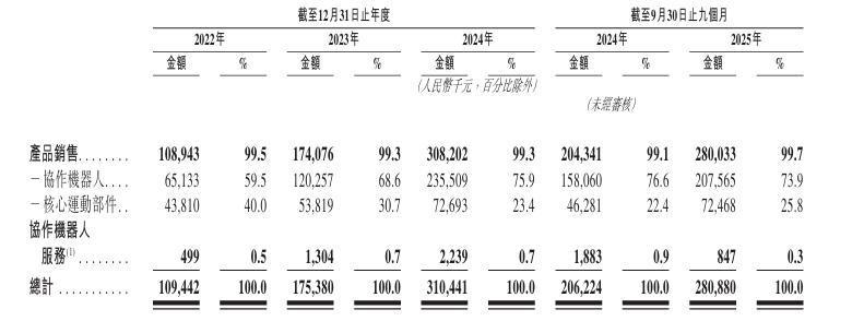 下表载列于所示期间公司按产品和协作机器人服务性质划分的收益绝对金额及占总收益的百分比明细: