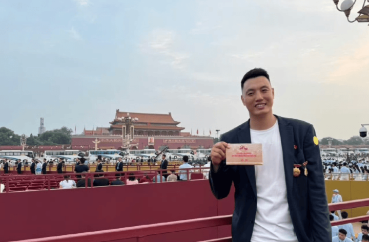 北京首钢男篮队长翟晓川,佩戴北京青年榜样奖章和首钢劳动模范奖章,与前篮协主席姚明一同受邀观礼,成为篮球界的骄傲代表。