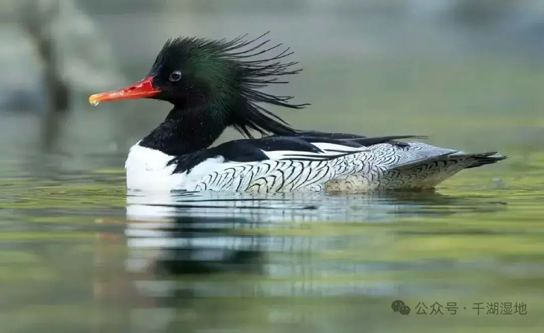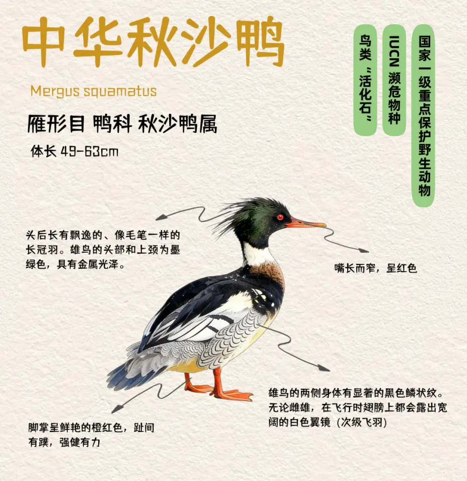 这是一种被誉为鸟类“活化石”的珍禽——中华秋沙鸭。它头戴桀骜的蓬松羽冠,身披黑白相间、侧染锈红的“泼墨华服”,最特别的是,两胁的羽毛上布满精巧的鳞状纹路,宛若一件匠心独运的艺术品。作为全球濒危物种、我国一级重点保护野生动物,它对生存环境有着近乎苛刻的要求:必须是最洁净的活水、最丰富的鱼虾,以及沿岸最原始的森林树洞中来繁衍后代。它的存在,本身就是一份流动的生态检验报告。今天,就让我们一同了解这位从远古时代翩然而至,如今却无比珍稀的“国宝级”潜水精灵。