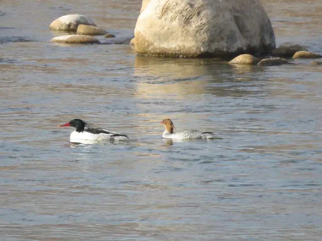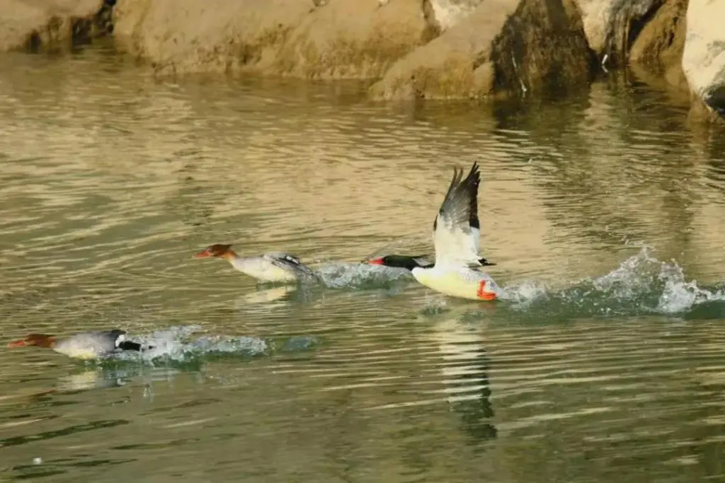 中华秋沙鸭是水系生态的“顶级鉴定师”,它的所有习性都围绕着对原始纯净环境的极致依赖。白天大多在水中游弋或潜入水下捕鱼。它们拥有鸟类中独一无二的“树洞房”习性,必须在河流岸边高大乔木的天然树洞中繁殖,雏鸟出生几天后就得勇敢地跳下高空,随亲鸟入水。