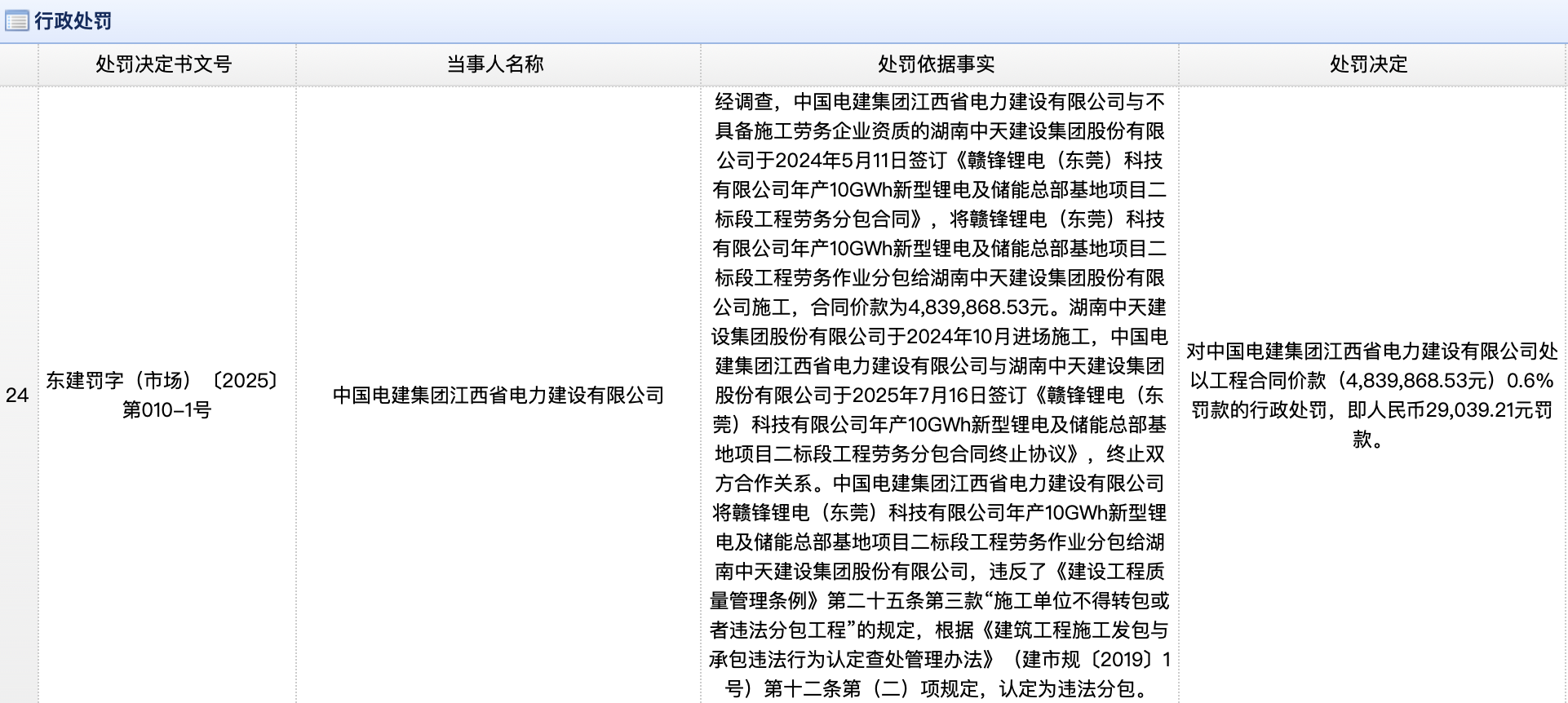 近日,东莞市住建局发布行政处罚消息称,中国电建集团江西省电力建设有限公司将赣锋锂电(东莞)科技有限公司年产10GWh新型锂电及储能总部基地项目二标段工程劳务作业违法分包给湖南中天建设集团股份有限公司,被罚款近3万元。湖南中天建设集团股份有限公司则因无资质承揽工程行为,被罚款约10.6万元。